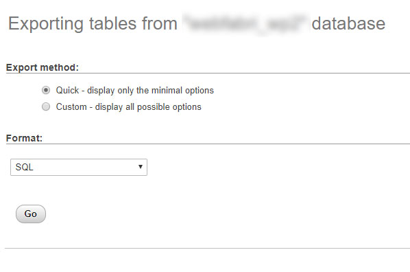- Zatim označite opciju „Quick – display only the minimal options“ odaberite format „SQL“ i pritisnite dugme „Go“. Sačekajte da se SQL baza skine na vaš kompjuter.