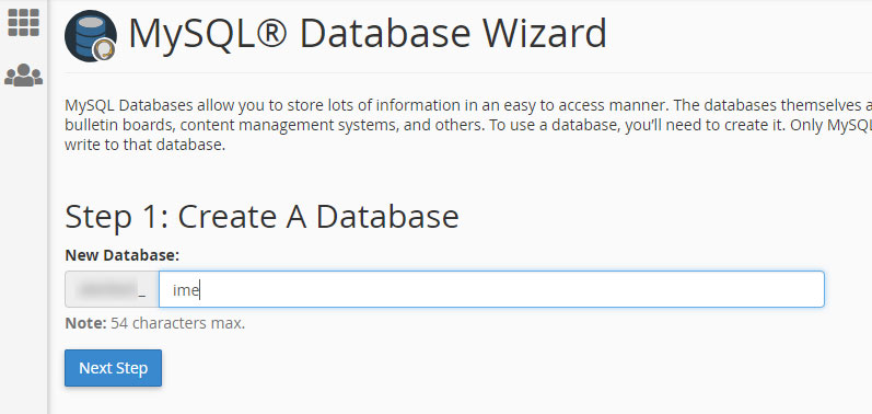 - Kreirajte ime za naziv vaše nove baze i kliknite dugme „Next Step“