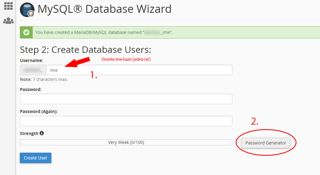 - Kreirajte ime korisnika (može biti isto kao i ime baze), zatim kliknite na dugme „Password Generator“