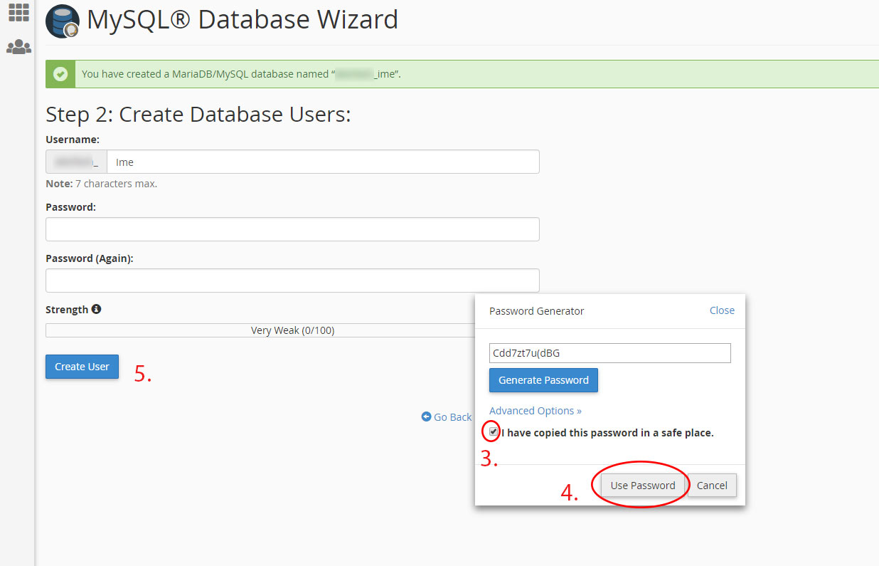 - Kliknite par puta na plavo dugme „Generate Password“, kopirajte password tamo gde ste zapisali ime novokreirane baze zatim otkačite „I have copied this password in safe place“ i kliknite na dugme „Use Password“ zatim na dugme „Create User“