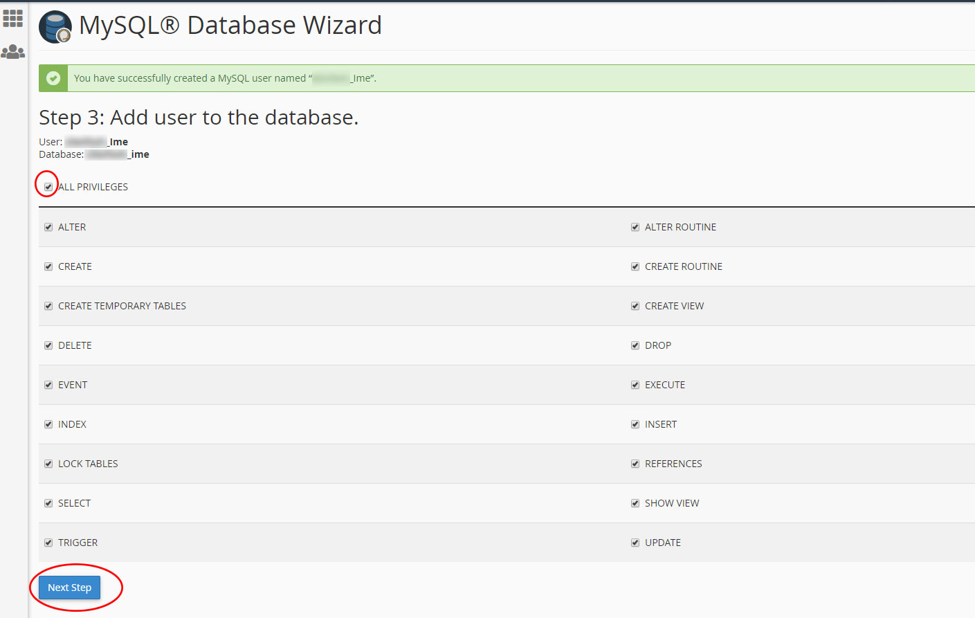 - Otkačite opciju „ALL PRIVILEGES“ i kliknite na plavo dugme „Next Step“