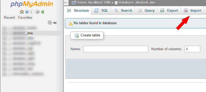 - Kliknite na ime vaše novo kreirane baze (lista sa leve strane) zatim kliknite na dugme „Import“ odmah pored dugmeta „Export“ koje ste koristili u prethodnom koraku.