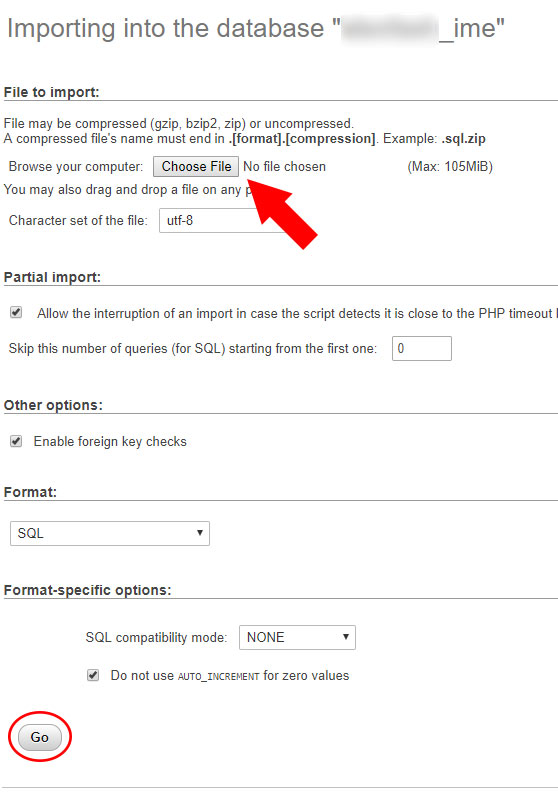 - Kliknite na dugme „Choose File„ pronadjite bazu koju ste exportovali na kompjuter i kliknite dugme „Open„ zatim kliknite na dugme „Go“ne zatvarajte prozor dok se baza ne importuje. Na kraju će vam na vrhu ekrana biti ispisano u zelenoj traci da je baza uspešno importovana. Dok se baza importuje vi možete da pređete u drugi tab gde vam se nalazi glavna stranica Cpanel-a i pokrenete importovanje fajlova sajta.