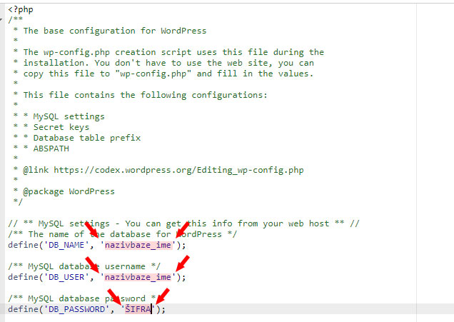 - Unosite naziv baze, user i password koji ste kreirali u koraku #3. Brišete stare nazive i umesto njih unosite nove. Ne brišete apostrofe nego samo nazive, takođe nove nazive i sifru unosite između apostrofa. Kada ste uneli kliknte na plavo dugme u gornjem desnom uglu „Save Changes“