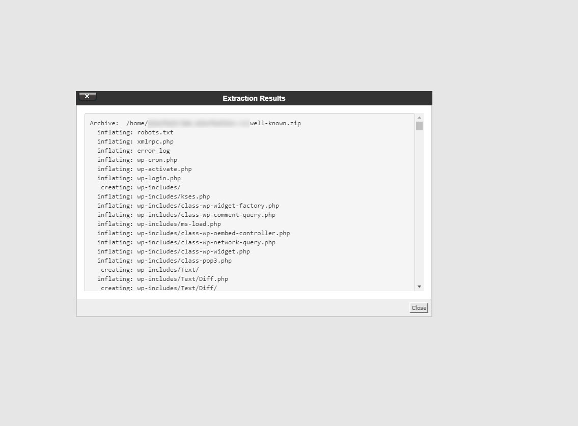 - Kada ste uspešno uploadovali fajl kliknite na dugme „Go Back to „/home/…“ Kliknite na vaš zipovan fajl i kliknite na dugme „Extract“ i „Extract File(s) sačekajte da se raspakuje zipovan fajl i kada vam izađe prozor sa spiskom raspakovanih fajlova kliknite na dugme „Close“.