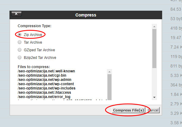 - Odaberite opciju „Zip archive“ i kliknite na dugme „Compress file(s)„, sačekajte da se izvrši kompresovanje fajlova. Kada se završi kompresovanje kliknite na dugme „Close„