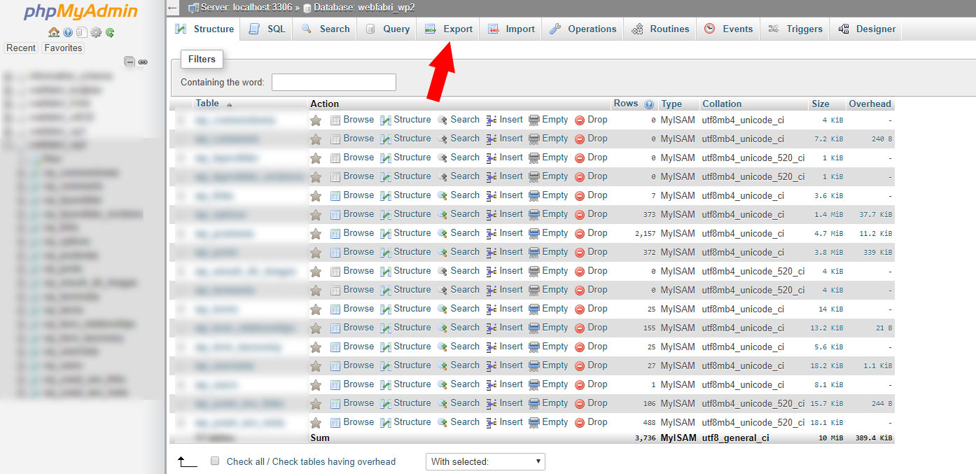 - Kliknite prvo na bazu koja je dodeljena sajtu (naziv_baze) sa leve strane pa onda kliknite na dugme „Export“